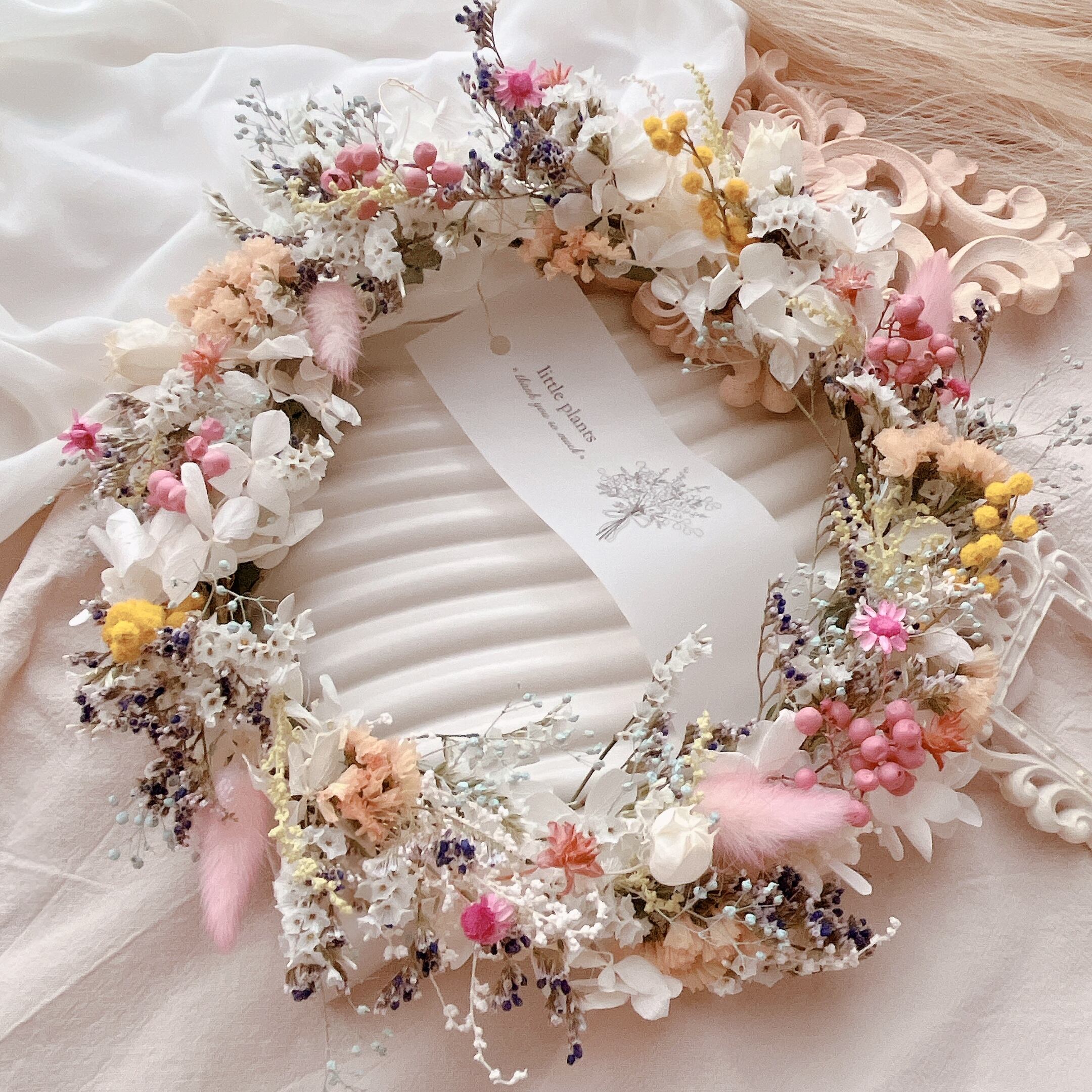 *ドライフラワーはその性質上、多少ポロポロと落ちてしまう事があります。大きな花材が取れてしまっていた場合は、お手数ですがボンド等で貼り付けてくださるようお願い致します。
